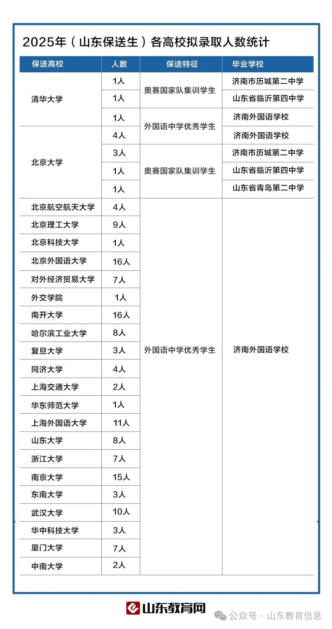 近日,阳光高考官网公布了2025年拟录取保送生名单。来自山东4所中学的12名中学生入选清北2025年拟录取保送生名单。 其中,5名来自济南外国语学校,4人来自济南市历城第二中学,2人来自山东省临沂第四中学,山东省青岛第二中学有1人上榜。 2025各高校拟录取山东保送生人数统计 一起来看↓↓↓